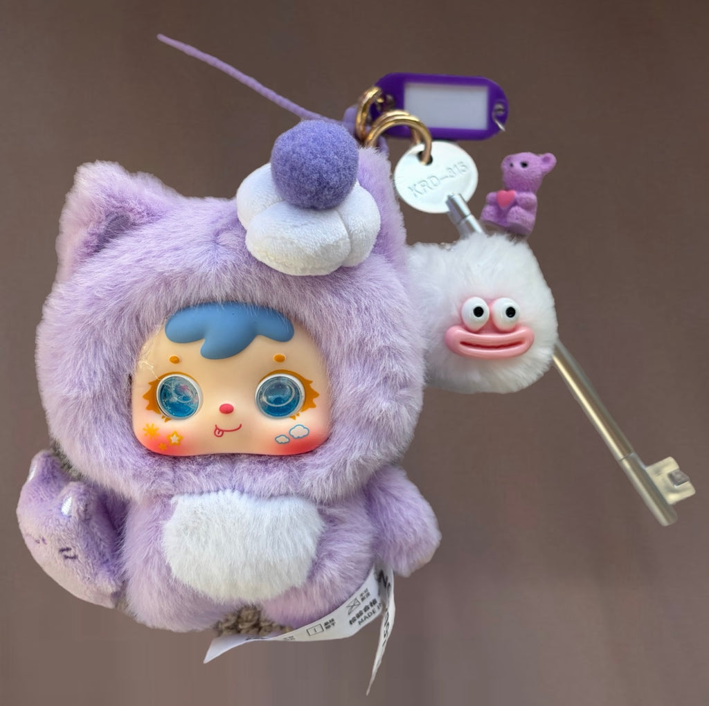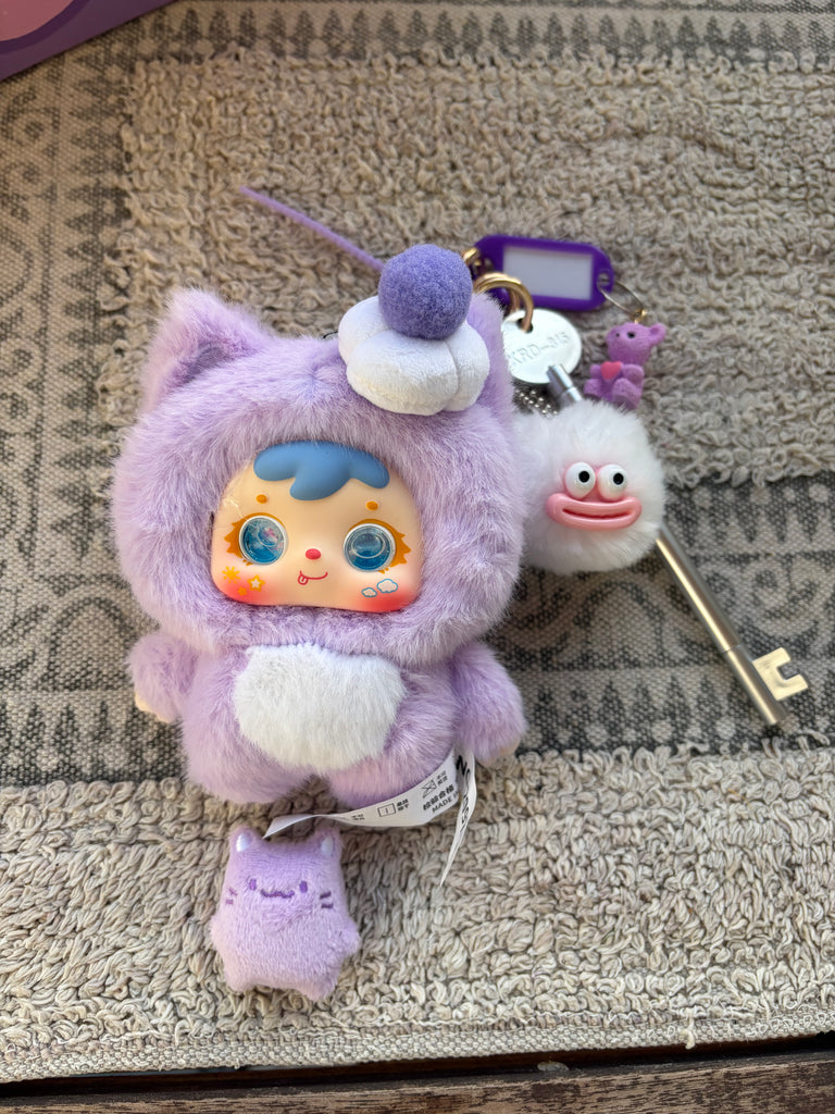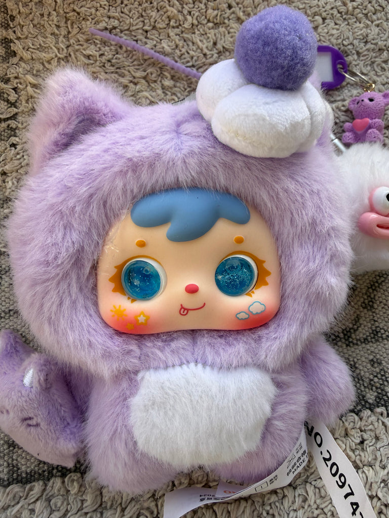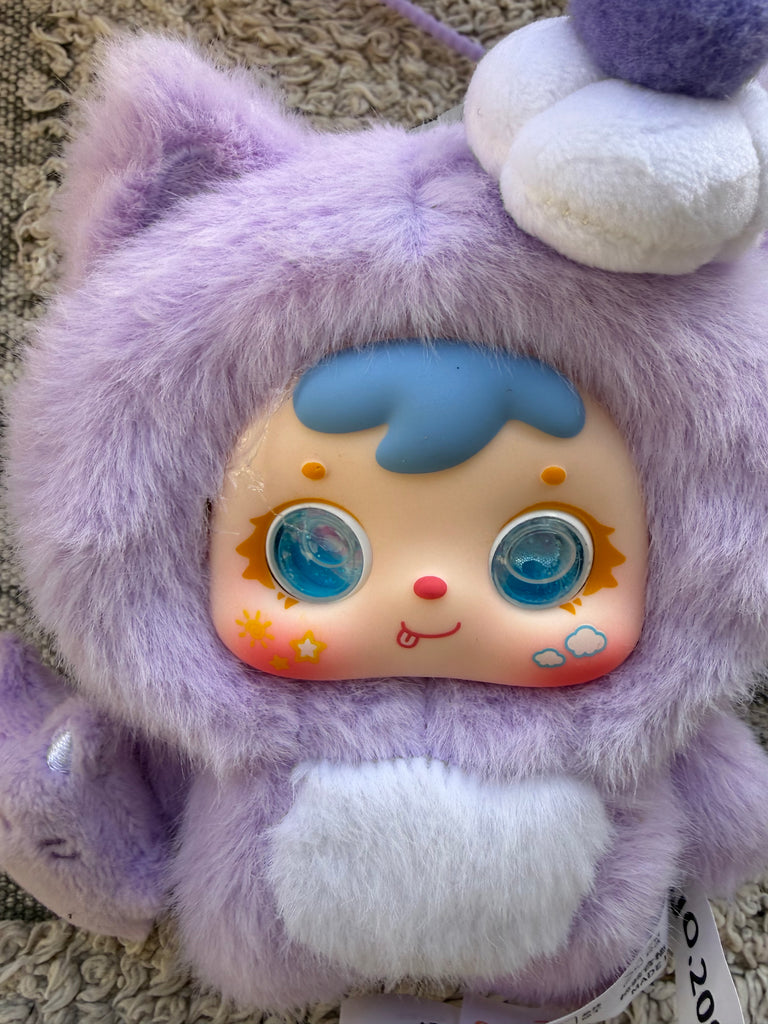gli occhi del Samuel sono intercambiabili puoi scegliere tra due espressioni diverse .. il pupazzo Samuel ha un gattino lilla in peluche sulla manina estraibile che e’ una calamita