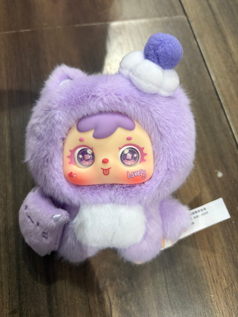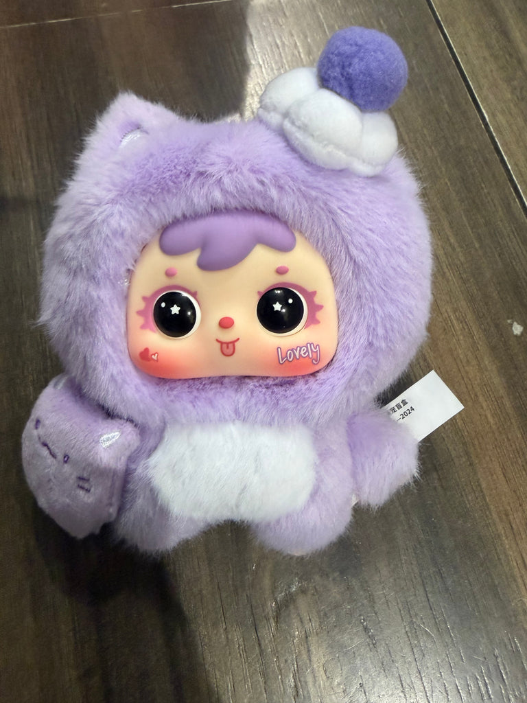gli occhi del Samuel sono intercambiabili puoi scegliere tra due espressioni diverse .. il pupazzo Samuel ha un gattino lilla in peluche sulla manina estraibile che e’ una calamita