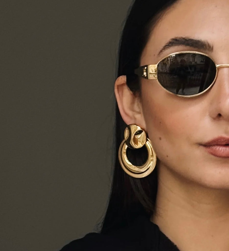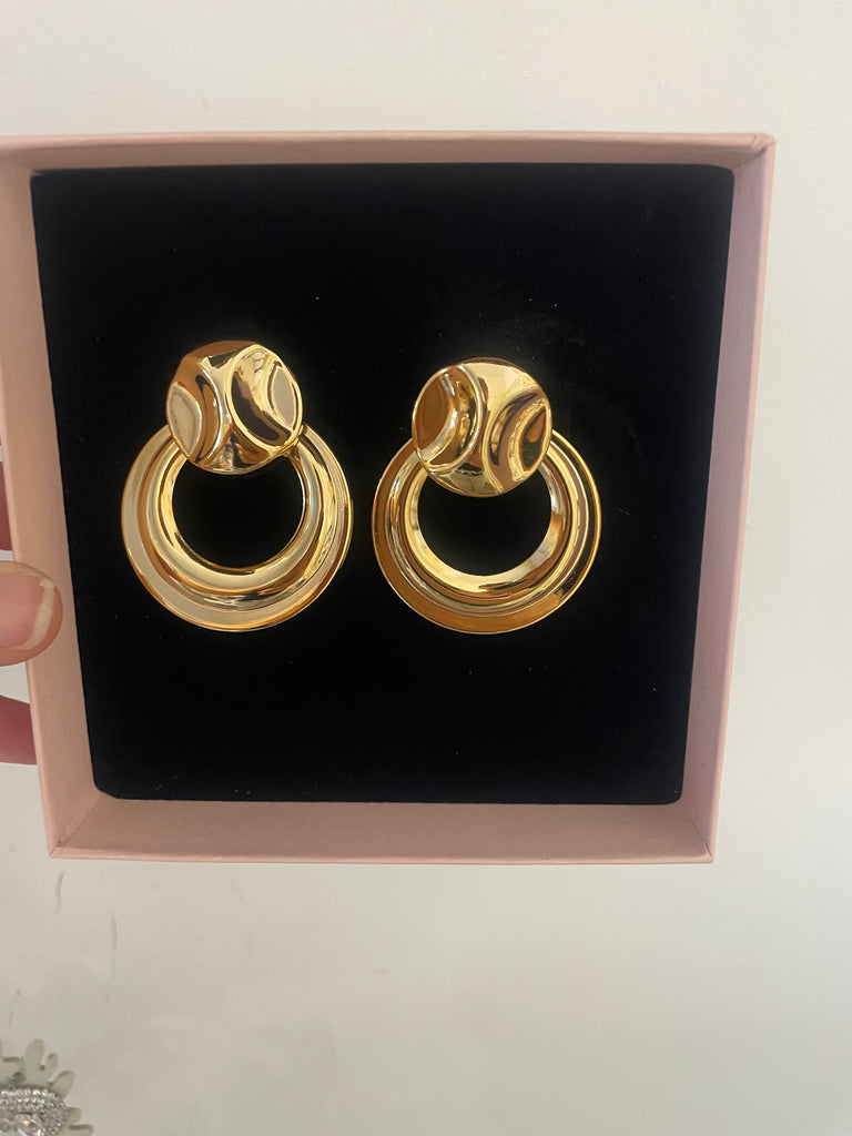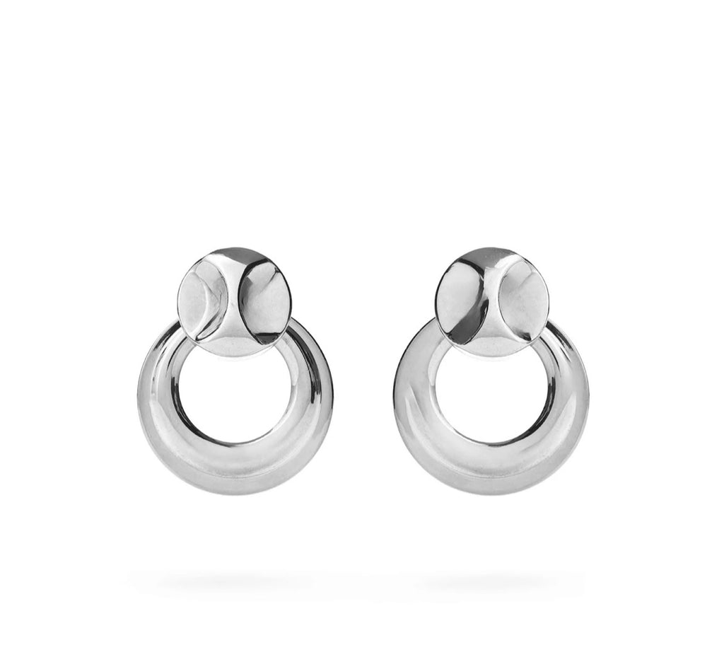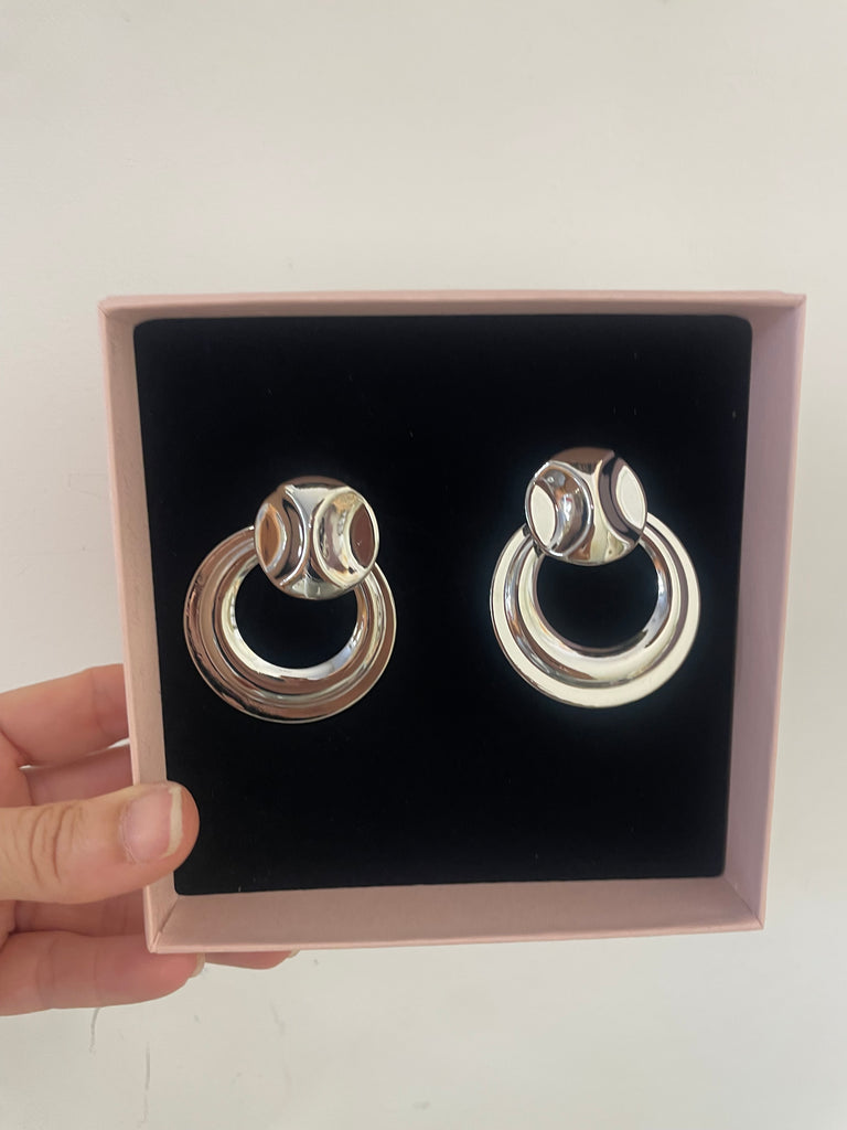 Questi orecchini hanno un design moderno e semplice. Sono composti da due elementi: un piccolo cerchio bombato nella parte superiore e un anello più grande che pende sotto. Le linee sono lisce e arrotondate, dando un aspetto pulito ed essenziale. Il loro stile minimal li rende facili da abbinare, perfetti sia per un look quotidiano che per qualcosa di più elegante.