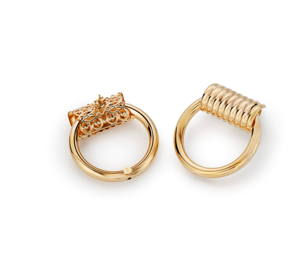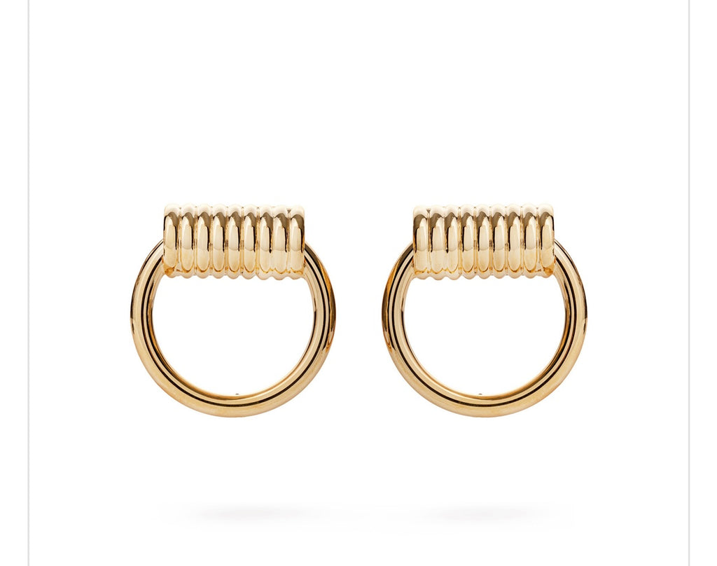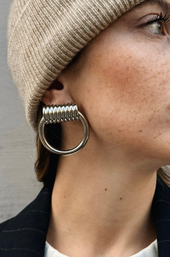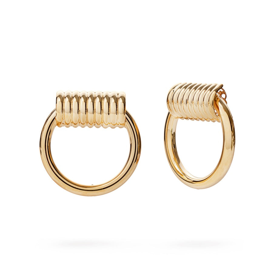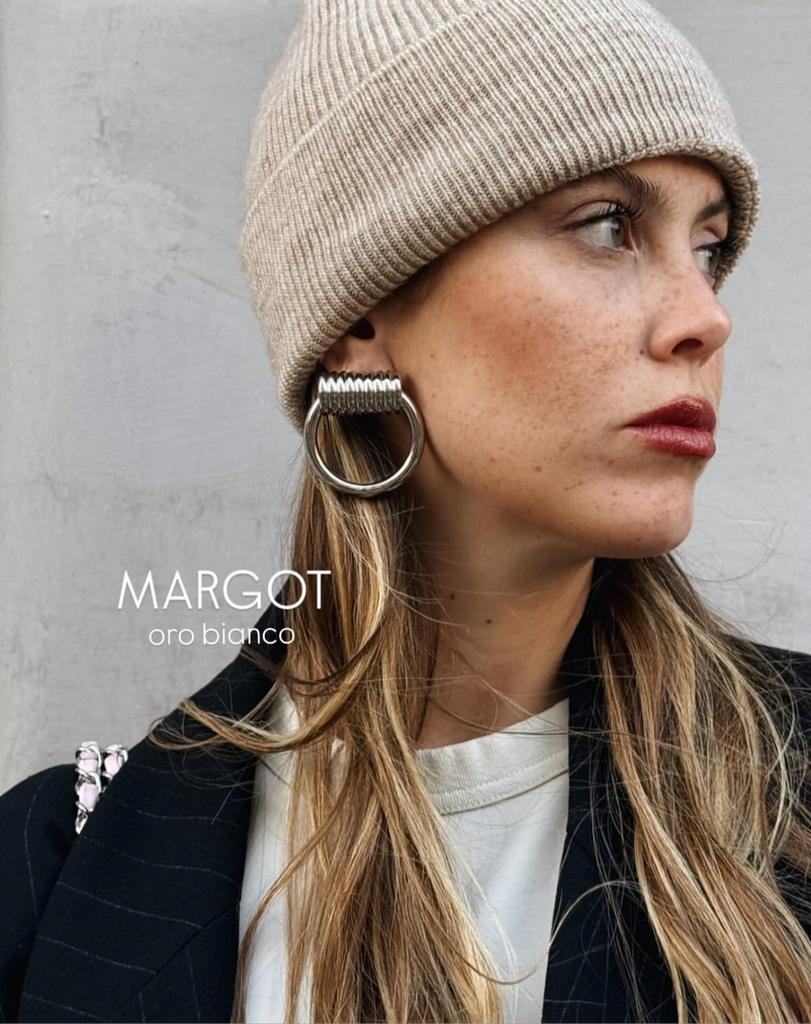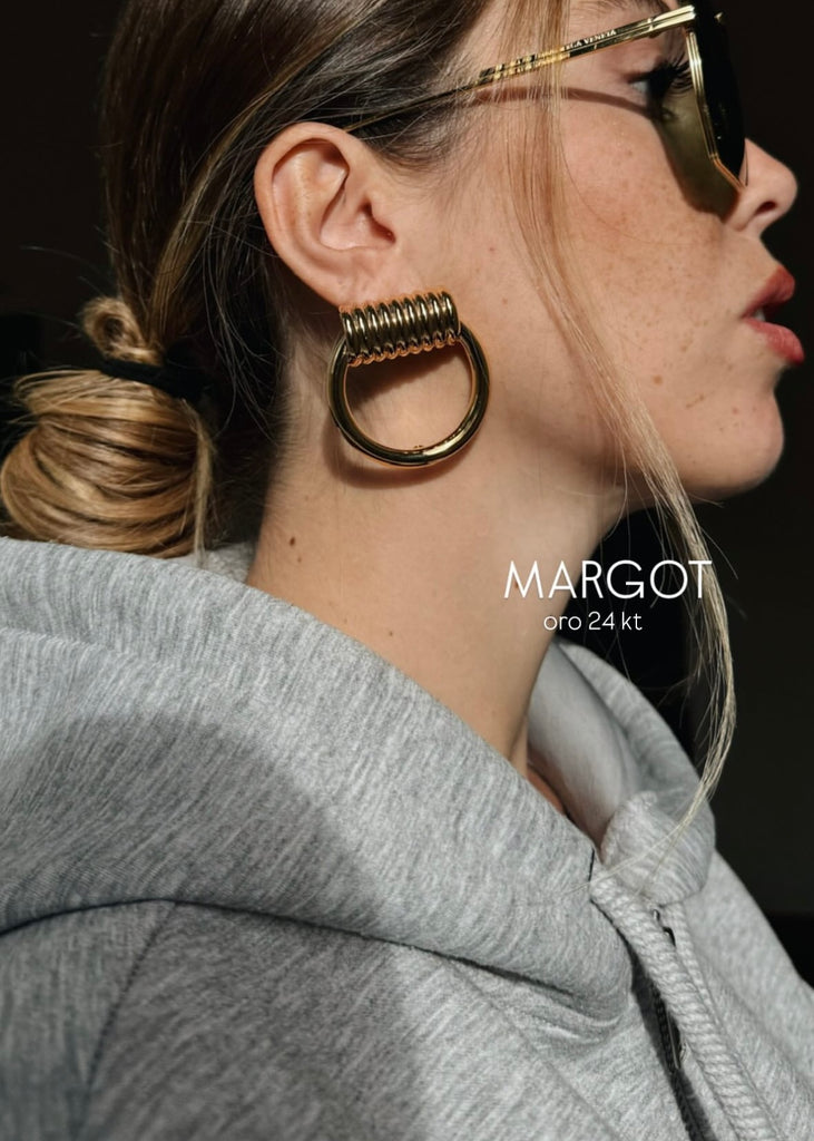 I cerchi Margot dal design moderno e originale, con una parte superiore a spirale che si collega a un grande cerchio liscio. Hanno un look luminoso e di carattere, perfetti per dare un tocco di personalità al tuo outfit.