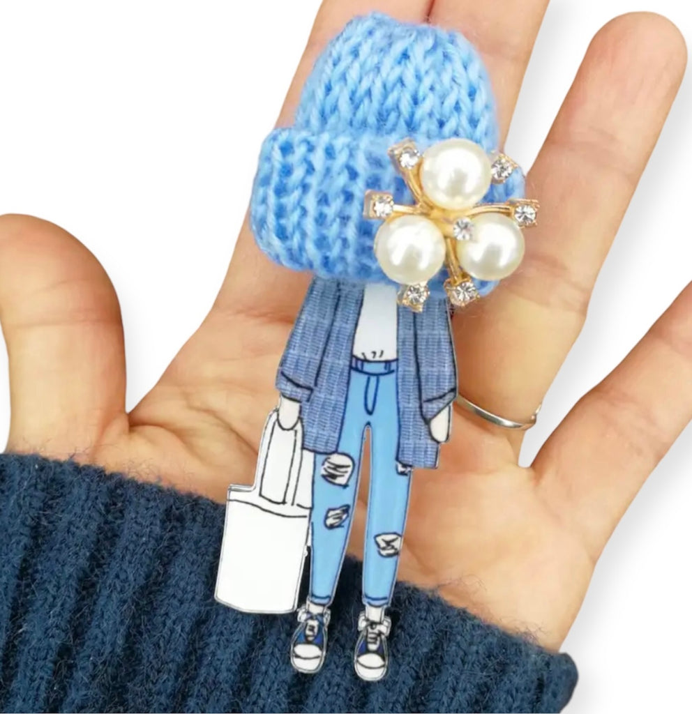 Spilla con modella fashion e cappellino in lana celeste con perle