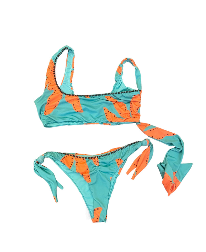 Bikini top con slip americano regolabile in tessuto jersey stampato, bordato con perline ricamate.