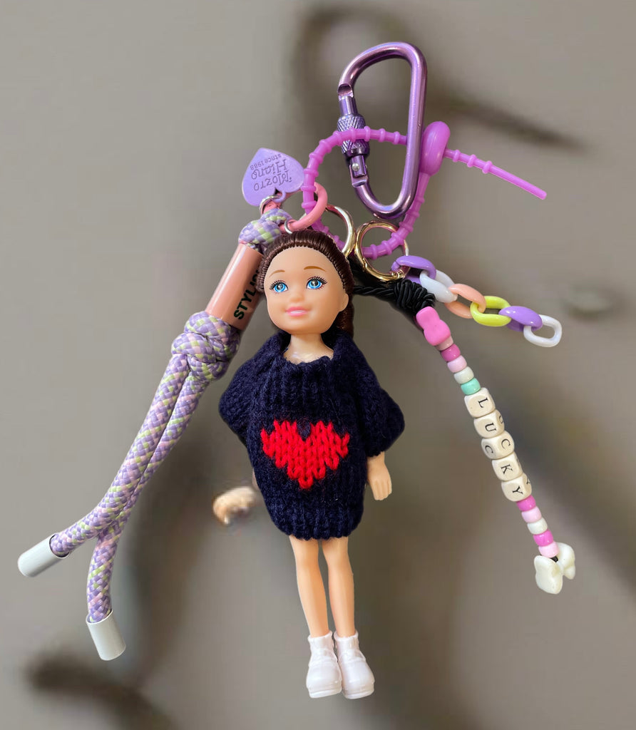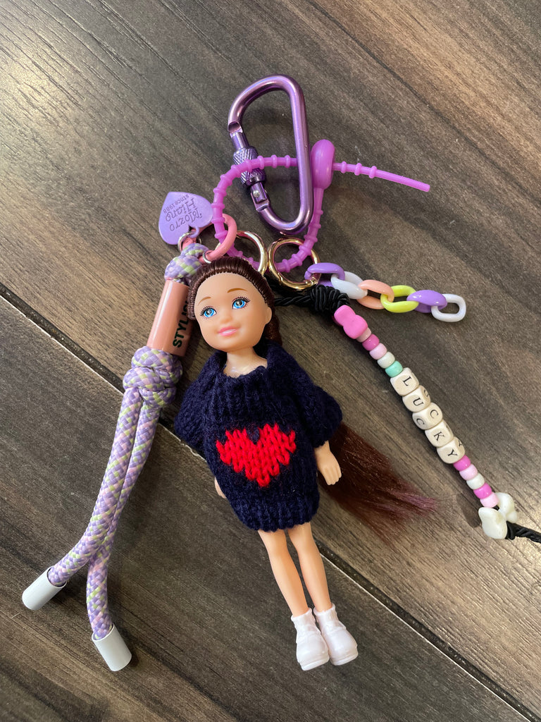 Pimp your Bag Keychain charms per borsa e portachiavi Keychain charms Barbie Shelly capelli castani abitìni nero cuore rosso