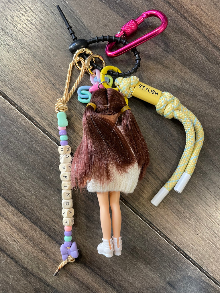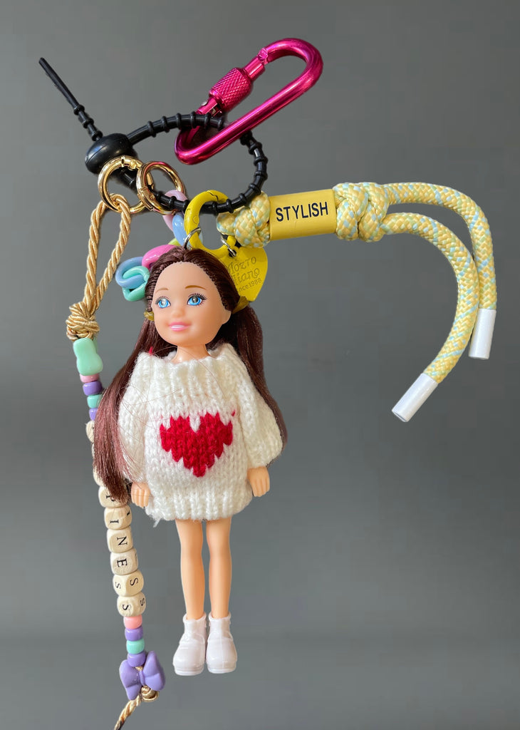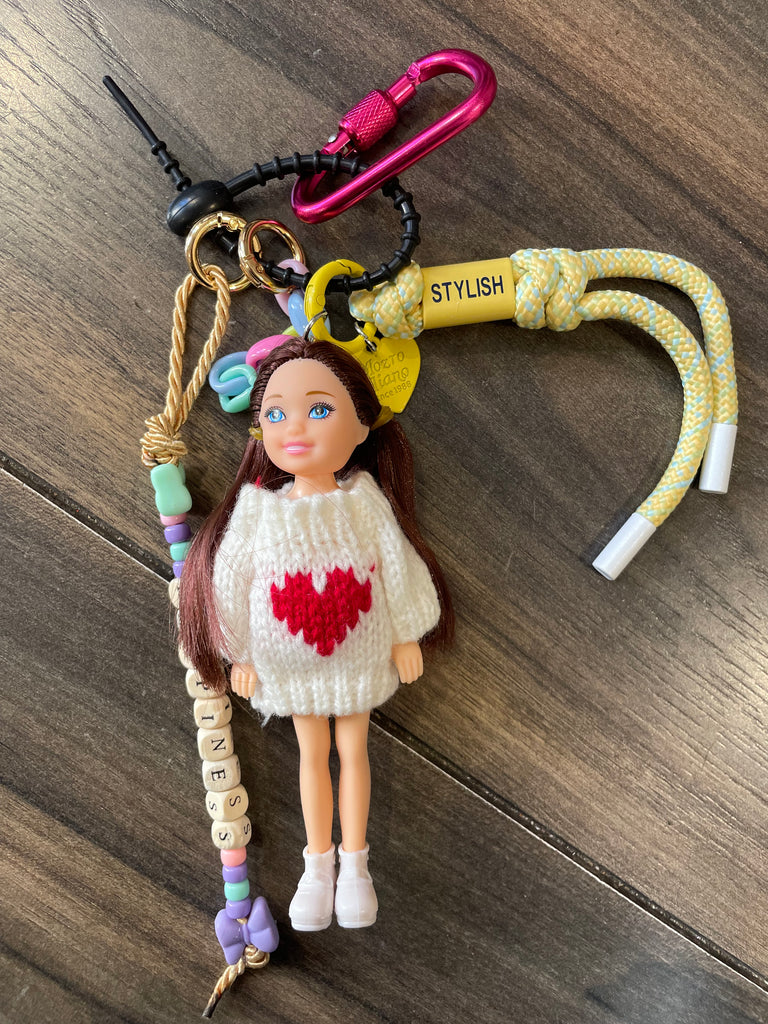 Pimp your Bag portachiavi e applique per borsa Barbie Shelly capelli castani e maglioncino panna cuore rosso